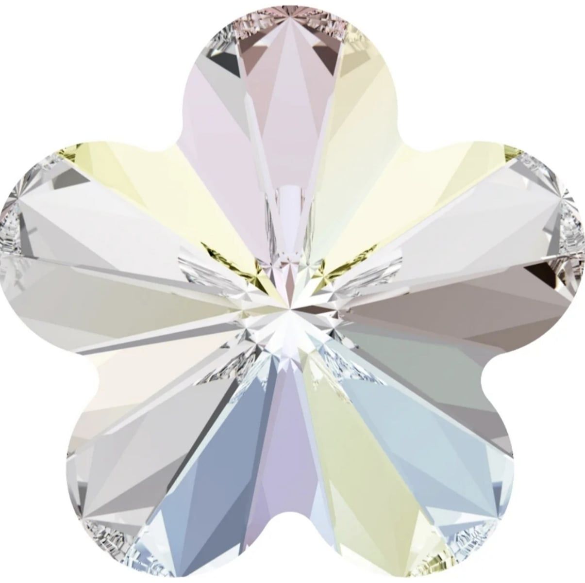 Cabochon fleur Swarovski référence 4744, 10 mm, coloris Crystal AB, transparent irisé, en cristal à surface taillée et dos non plat type Fancy Stone, destiné au collage ou au montage sur support adapté. Sa surface taillée renforce l’éclat une fois intégré dans un bijou ou une création brodée.