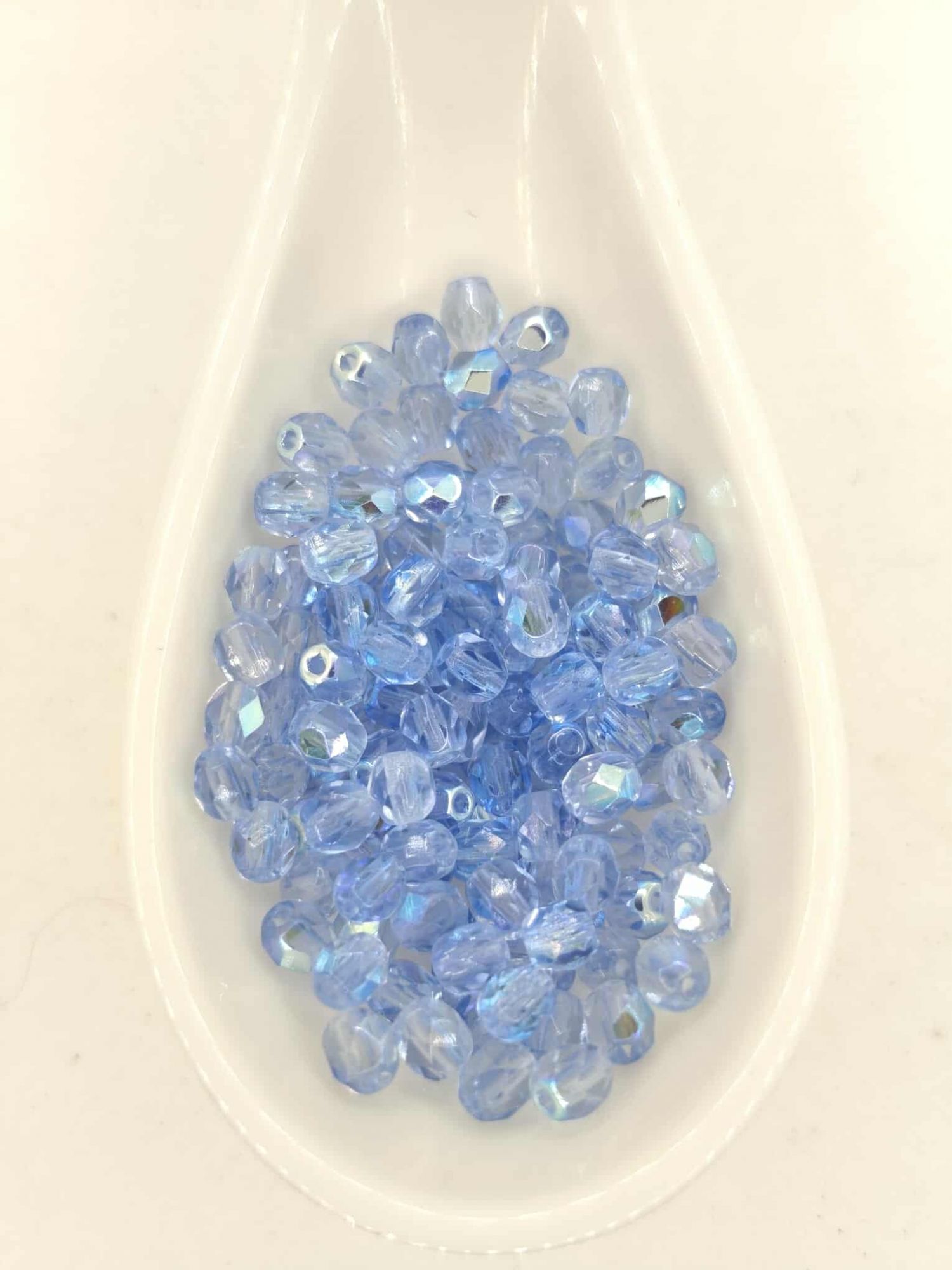 Ces perles facettes en cristal de bohême Sapphire clair AB 4mm sont teintées dans la masse.