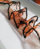 Ce ruban vendu au mètre est en organza, il est magnifique, floqué avec de jolies araignées velours noires, les bords sont rigidifiés avec un ruban métallique noir.