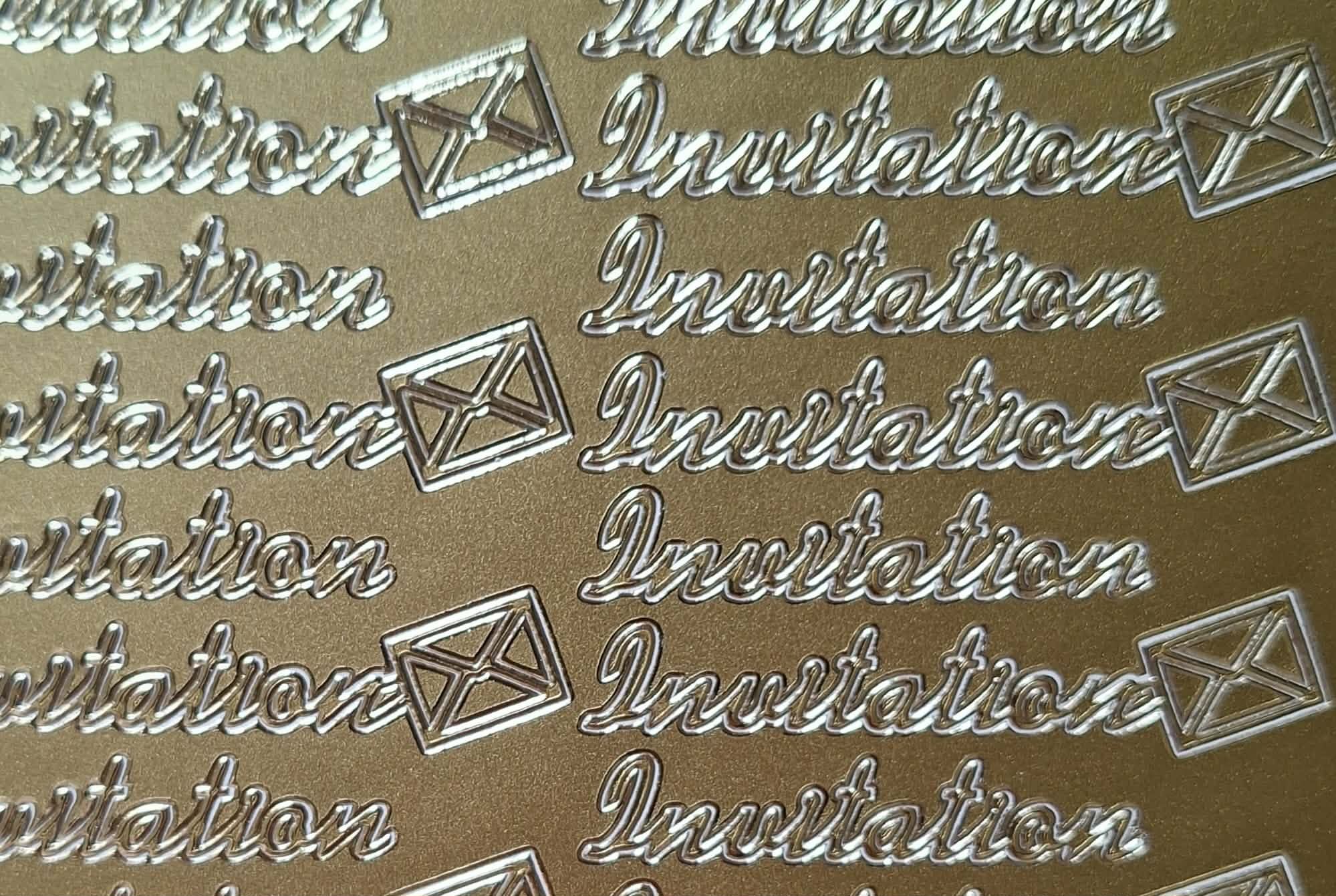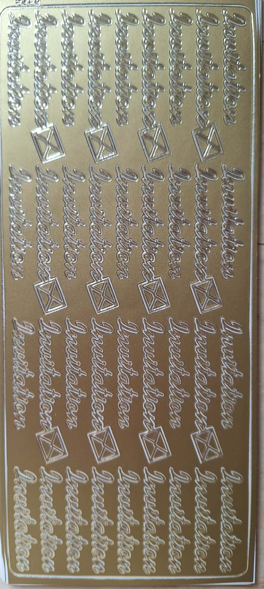 Planche de stickers autocollants peel off 36 mots "invitation" doré.